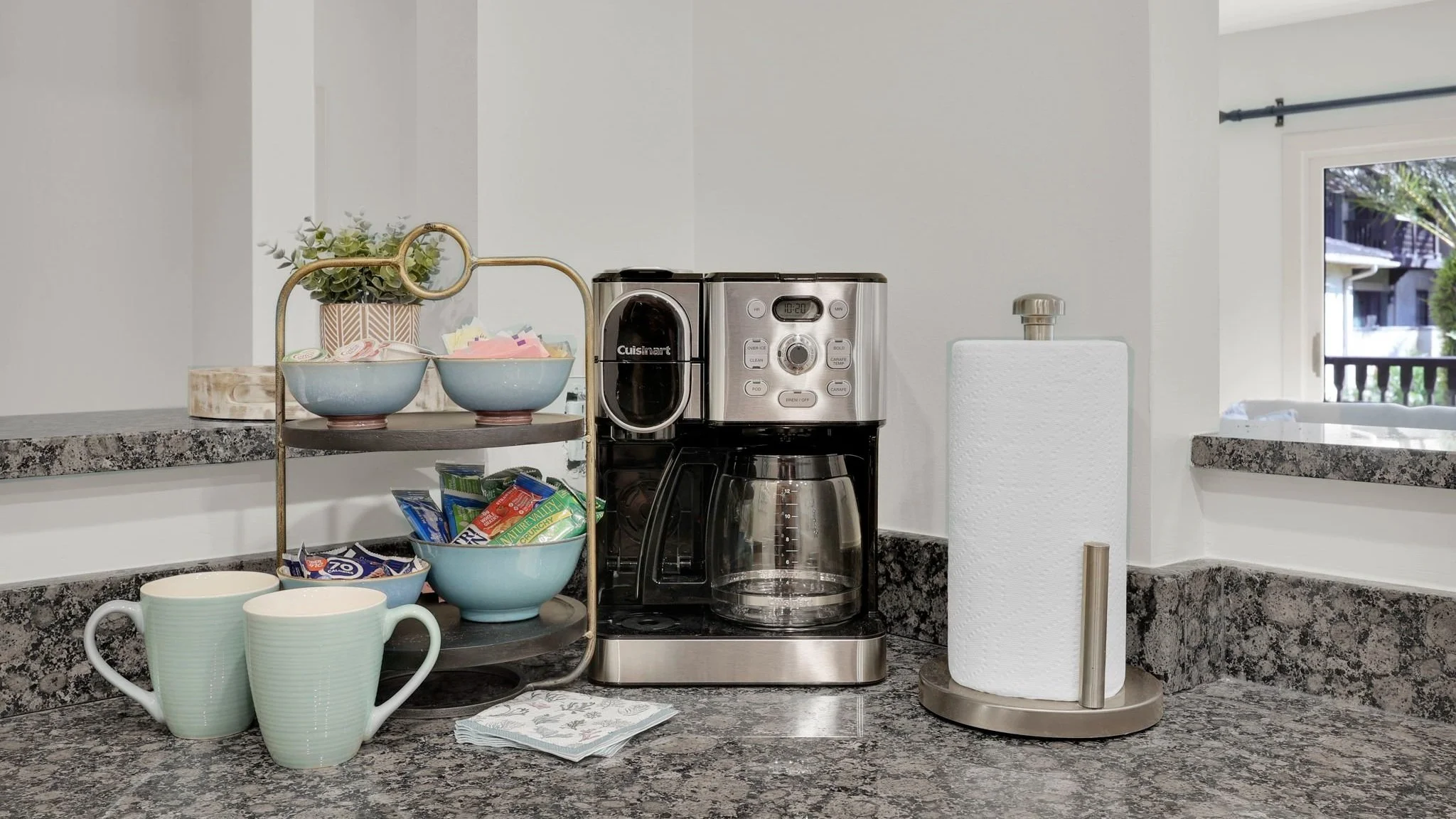 A well-equipped kitchen, including an air fryer, coffee maker, and tea kettle ~ Click here for you curated list of essentials.