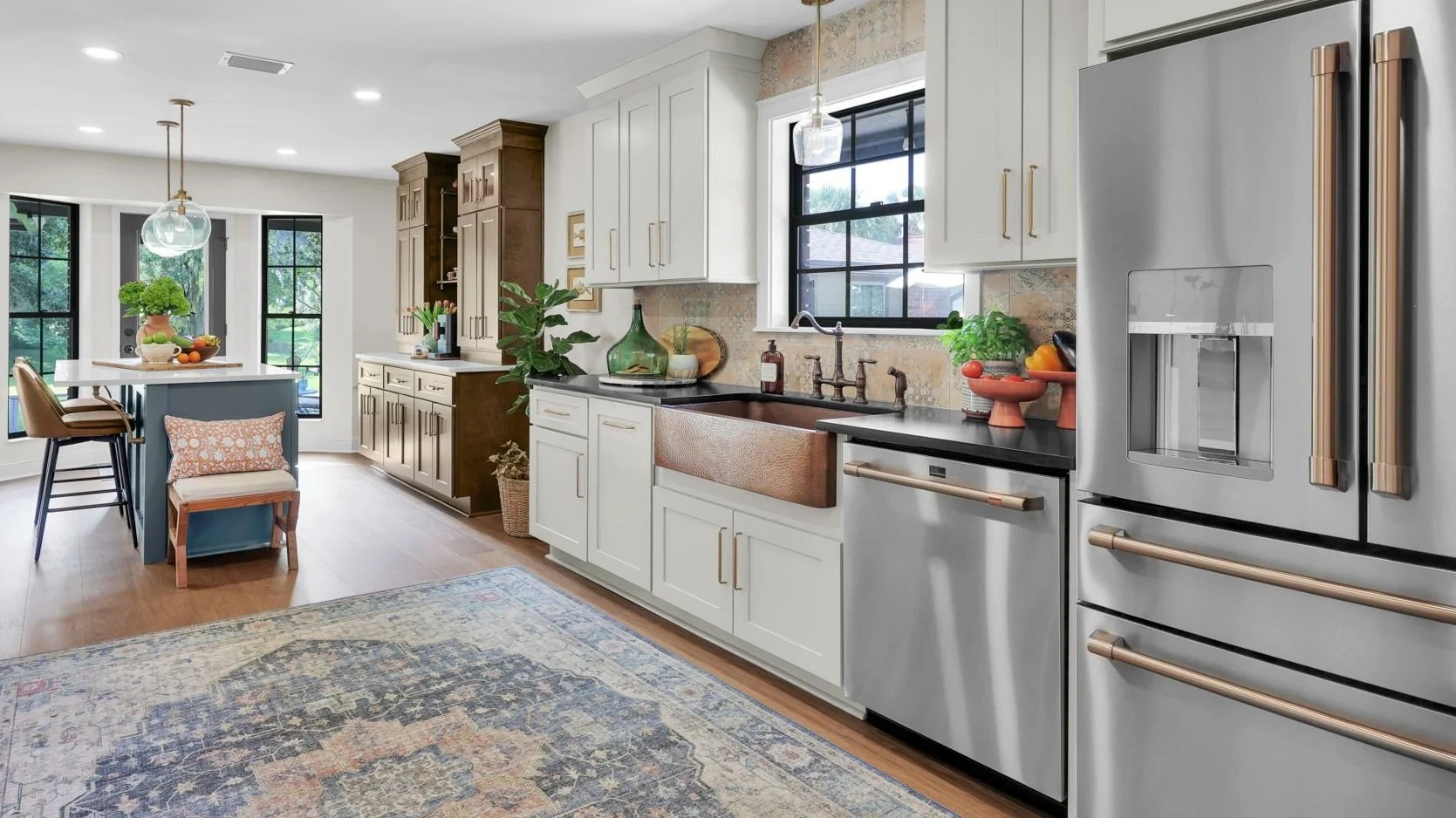One standout feature of this renovation is the stunning hand-hammered copper farmhouse sink by Thompson Traders. This choice adds a sense of history and timeless appeal, blending beautifully with various design styles. Copper is not only durable but also develops a unique patina over time, enhancing its charm and character.